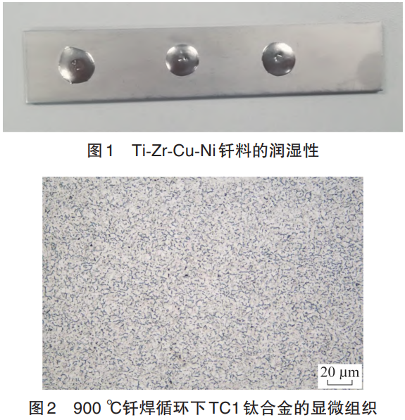 根据差热分析结果及钎焊温度设置原则,Ti-Zr-Cu-Ni 钎料的钎焊温度接近 900℃,因此在 900℃的条件下,对 Ti-Zr-Cu-Ni 钎料开展润湿性试验,试验结果如图 1 所示。Ti-Zr-Cu-Ni 钎料在 900℃的钎焊温度下呈光亮球状形态,几乎无铺展现象,表明钎料在此钎焊温度下的流动性较差,而钎料的流动性不足会使后续钎料对钎缝的填充产生不利的影响。若要改善钎料的铺展性能,则需进一步提升钎焊温度,根据材料手册,TC1 材料组织转变温度为 920~930℃,当温度达到此区间时,其基体组织会发生转变。实际上,在钎焊温度为 900℃时,TC1 钛合金已经出现了组织转变的情况,如图 2 所示,故 Ti-Zr-Cu-Ni 钎料不适用于TC1钛合金的钎焊。本文后续不再开展该钎料的研究,重点研究 Ag-Cu-Ti 和 BTi3 钎料 2 种钎料。