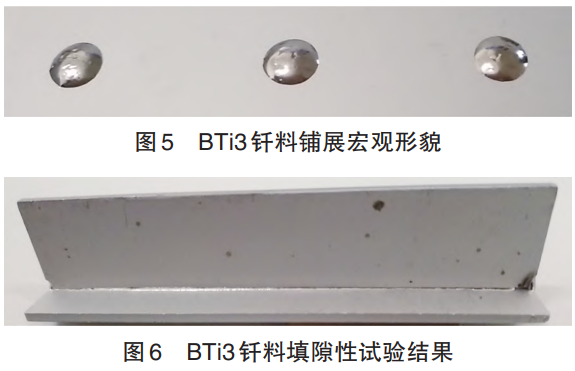对于 BTi3 钎料,采用二甲苯黏结剂对其进行调制,在 860℃×15min 的工艺参数下,开展润湿铺展试验,结果如图 5 所示。由图 5 可知,钎料展现出良好的润湿性,表面呈金属光泽。