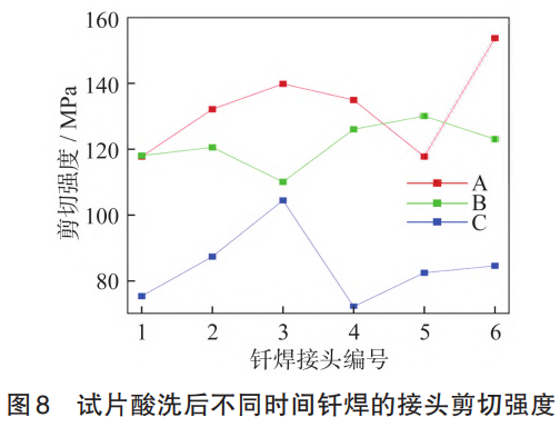因为钛合金属于特殊焊接材料,其表面对氧化反应具有较高的敏感性,为确保焊接质量,在焊接前需进行酸洗处理,为确定酸洗后焊接的时间控制,对比了酸洗后不同时间对钎焊缝的剪切强度。