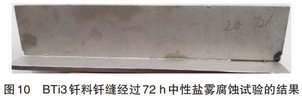 依据 GB/T 10125-2021 要求对 BTi3 钎料钎焊 + 退火 (先真空钎焊循环再退火处理) 后的 T 型接头钎焊缝开展了时长为 48、72、96、120、144h 的中性盐雾腐蚀试验,试验结束后,试片置于常温环境下放置 48h 后观察,结果显示,所有试片钎焊缝处均未出现腐蚀现象及腐蚀物,其中经过 72h 中性盐雾腐蚀试验的结果如图 10 所示。