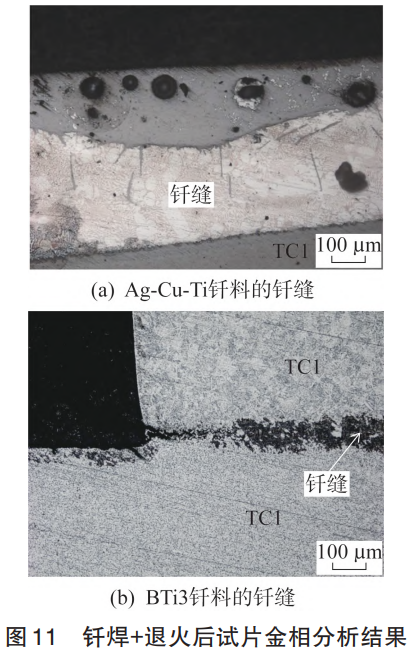为确定在该钎焊状态下,两种钎料对TC1钛合金组织的影响机制,对钎焊 + 退火的试片进行了金相剖切,如图 11 所示。