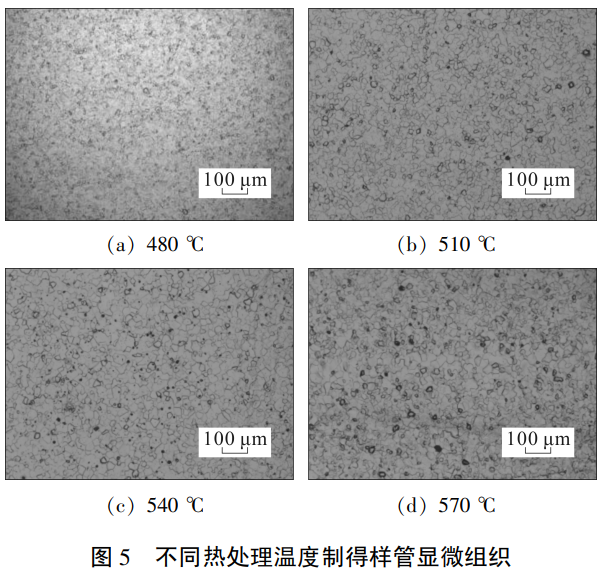 由图 5 可知,随着热处理温度升高,等轴组织所占比例逐渐增大,组织演变顺序为晶粒完成了再结晶但未长大 (图 5b)、再结晶完成并有一定程度的长大 (图 5c) 以及晶粒明显粗化 (图 5d), 并且在不同温度下退火都有一定量的孪晶现象,这是因为随着热处理温度升高,管材静态再结晶程度逐步升高,在畸变能较高部位首先出现细小晶核,晶核逐渐长大并呈等轴化,形成大角度晶界,金属内部因冷加工变形残留的各种缺陷随着再结晶过程完成而逐渐消失,管材塑性得到恢复,因此管材抗拉强度和屈服强度降低,延伸率升高。热处理温度为 540℃时,晶粒最大,等轴组织相对均匀,此时管材塑性最好、强度最低。热处理温度为 570℃时,晶粒开始有较多 β 相析出,β 相的析出致使组织等轴化程度降低,伴随有位错出现,此时管材塑性降低、强度增加。这与表 4 中拉伸性能数据基本一致。塑性对管材工艺性能和冷加工变形具有重要影响,因此热处理温度为 540℃时管材综合性能最佳。