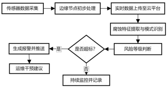 系统起始于传感器网络的高频数据采集,经过边缘处理节点降低带宽压力与响应延迟。随后数据上传至云平台,依托智能算法识别腐蚀特征与变化趋势。当风险等级超过阈值即触发报警,并输出干预建议。若未超标,则系统进入循环监控状态,实现动态追踪。该流程具备实时性、可扩展性与自学习能力,是构建煤化工装备腐蚀全生命周期管理体系的重要支撑。