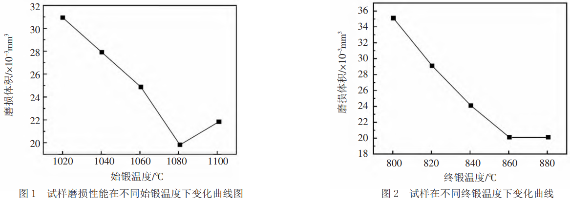 (1)当始锻温度不断上升至1100℃时,无论是试样磨损体积,还是单位面积增重均呈现先减小后增加的趋势,当始锻温度达到1080℃时,其试样的磨损体积有所下降,其下降幅度达到35.48%,单位面积质量增重有所下降,其下降幅度达到36.36%。当终锻温度达到860℃时,试样的磨损体积继续下降,下降幅度为42.86%,单位面积质量增重也出现明显下降,其下降幅度达到39.13%。