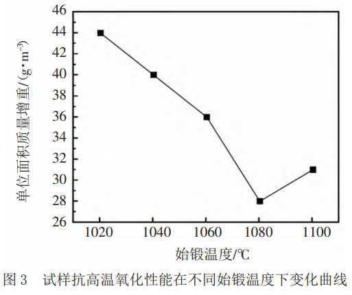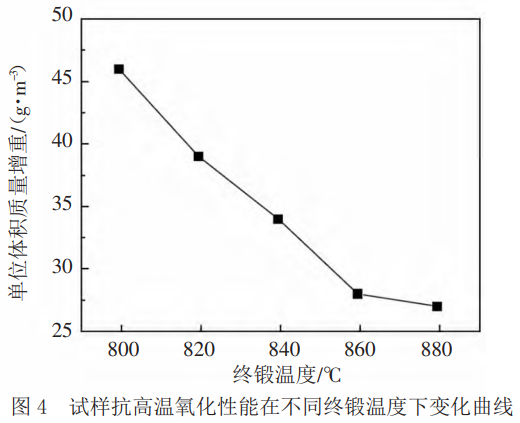 试样抗高温氧化性能在不同终锻温度下变化曲线如图4所示,从图4中可以看出,终锻温度最小值为800℃,最大值为880℃,对于新型钛合金而言,其单位面积质量增重最小值为27g.m-2,最大值为46g.m-2,整体呈现不断降低的趋势。该试样抗高温氧化性能会随着单位面积质量增重的不断上升而呈现上升趋势。