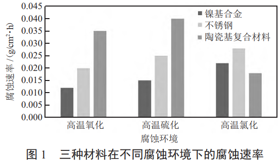 可以看出直观的数据对比,镍基合金在高温氧化和高温硫化环境中展现了较强的抗腐蚀能力,这与其优异的高温稳定性和较高的耐硫化性有关。陶瓷基复合材料在高温氯化环境中表现优异,表明其表面结构对氯化物的防护作用较强。相比之下,不锈钢在所有腐蚀环境中表现较为平庸,尤其是在高温硫化和氧化环境中,其耐腐蚀性较弱,这是由于钢基材的脆弱性以及表面钝化膜的损耗。