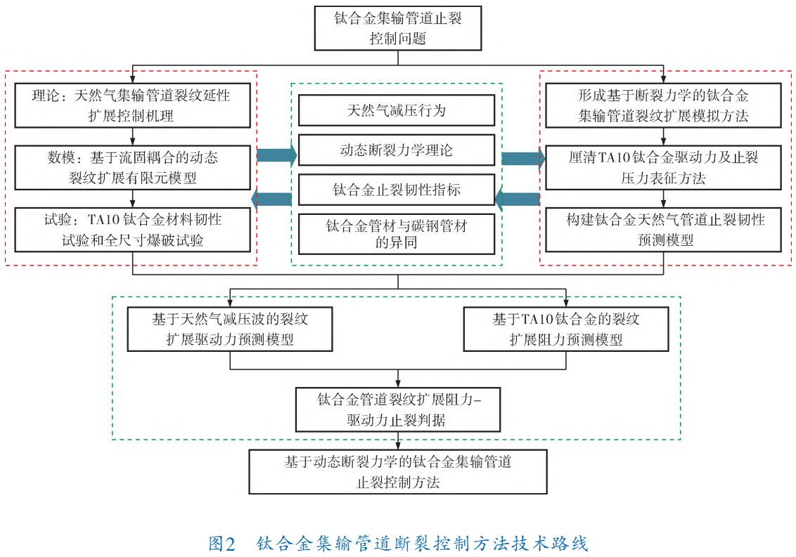 可以采用如图 2 所示的技术路线,基于动态断裂力学理论,开展钛合金管材韧性试验及全尺寸爆破试验研究,进一步采用流固耦合的动态裂纹扩展有限元模拟仿真,构建钛合金管道的止裂判据及止裂韧性计算模型,提出适用于钛合金集输管道的断裂控制方法,为实现钛合金管材在酸性气田的工业化应用提供理论依据。