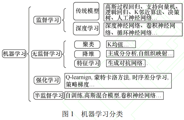机器学习算法通常分为监督学习、无监督学习,强化学习和半监督学习 [39]。如图 1 所示。最广泛使用的机器学习方法是监督学习方法 [40]。监督学习使计算机程序能够从训练集中的一组有标记的数据中学习,以便它能够以尽可能高的准确性从测试集中识别出未有标记的数据 [41]。在这个过程中,每个训练集都有一个对应于每个输入的标签。基于这种关系,通过对已有数据集的训练得到最优模型。这个过程通常使用优化算法来完成,比如梯度下降。当模型在指定的数据集上完成训练后,便能利用学到的映射规则对新的、未见过的输入进行预测。为了评估模型的预测准确性,我们会将其预测结果与测试数据集中的真实标签进行对比。数据集可以有多种形式,包括图像 [42-44]、音频剪辑 [45-46] 或文本 [47] 的形式。因此,监督学习在图像分类、语音识别、自然语言处理等多个领域得到了广泛应用,其中获取带有标签的数据对于训练出高精度的模型至关重要。