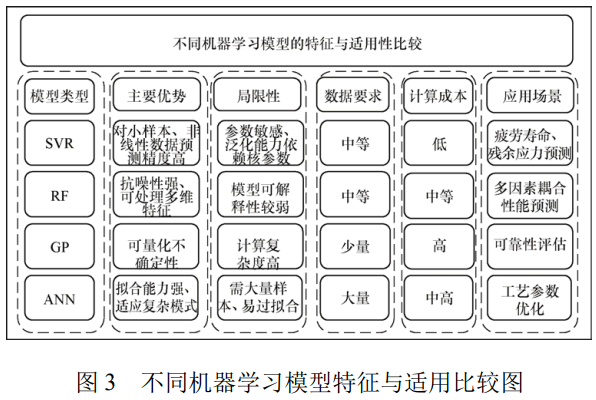 近期文献表明,将物理知识融入支持向量回归模型可显著提升其泛化能力,尤其在 WANG 等 [87] 的研究中,考虑相关物理知识的特征提取过程使支持向量回归模型在预测疲劳寿命方面展现出更优的性能。此外,在王蓝仪 [88] 的研究中,将支持向量回归与基于物理的模型 (如断裂力学模型) 结合,形成混合模型。这种结合可以提高预测的准确性,并确保预测结果在物理上的一致性。与传统应用不同,针对 Ti-6Al-4V 增材制造中工艺参数多样、特征维度高的问题,研究者通过引入多核 SVR 与基于物理约束的特征筛选方法,提高了小样本下的疲劳寿命预测精度。部分研究将 SVR 与有限元模拟数据结合,建立了工艺参数 - 残余应力的多维映射模型,实现了物理一致性预测。
