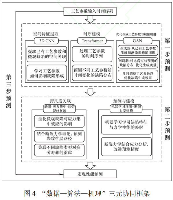 为打通 “工艺参数 - 微观缺陷 - 宏观性能” 跨尺度闭环,如图 4 所示,本文进一步构建 “数据 - 算法 - 机理” 三元协同框架。该框架在前述基于物理机理建模与智能算法融合研究的基础上,整合多源特征提取、对抗生成与机理约束学习,实现了从工艺参数到性能响应的可解释映射:3D-CNN 与 Transformer 并行抽取熔池空间特征和工艺时序演化,GAN 的生成对抗循环在高维潜在空间内快速锁定参数与缺陷间的映射关系;预测缺陷随即馈入缺陷应力集中疲劳裂纹扩展模型,以断裂力学一次性量化其对屈服和疲劳寿命的贡献,完成缺陷与性能的反向关联。两段网络端到端级联后,再植入 PINN 可微分物理约束与元学习跨任务先验,实现小样本场景下的物理可解释与跨机迁移能力同步提升,为航空航天级 Ti-6Al-4V 增材制造提供兼顾精度、可信度与工程落地性的统一解决方案。