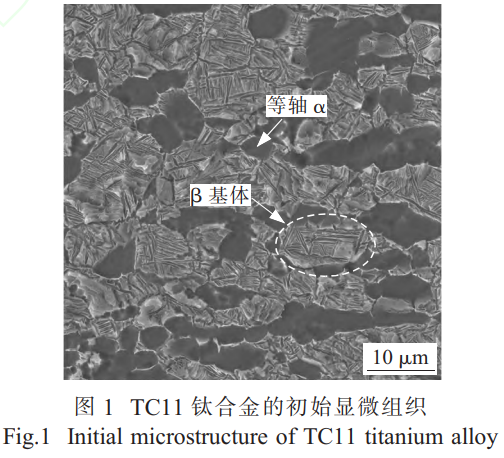 实验选用符合 GB/T2965 标准的 TC11钛合金锻造棒料(直径准 25mm,供货态为 α+β锻造组织),其相变点范围为 1010~1015℃。TC11合金的化学成分见表 1。从初始锻态材料中切取尺寸为 3mm×3mm×2mm 的试样。该合金的初始显微组织如图 1 所示,呈现标准的双态组织,其中灰暗色部分为 α 相,白亮色部分为 β 相。