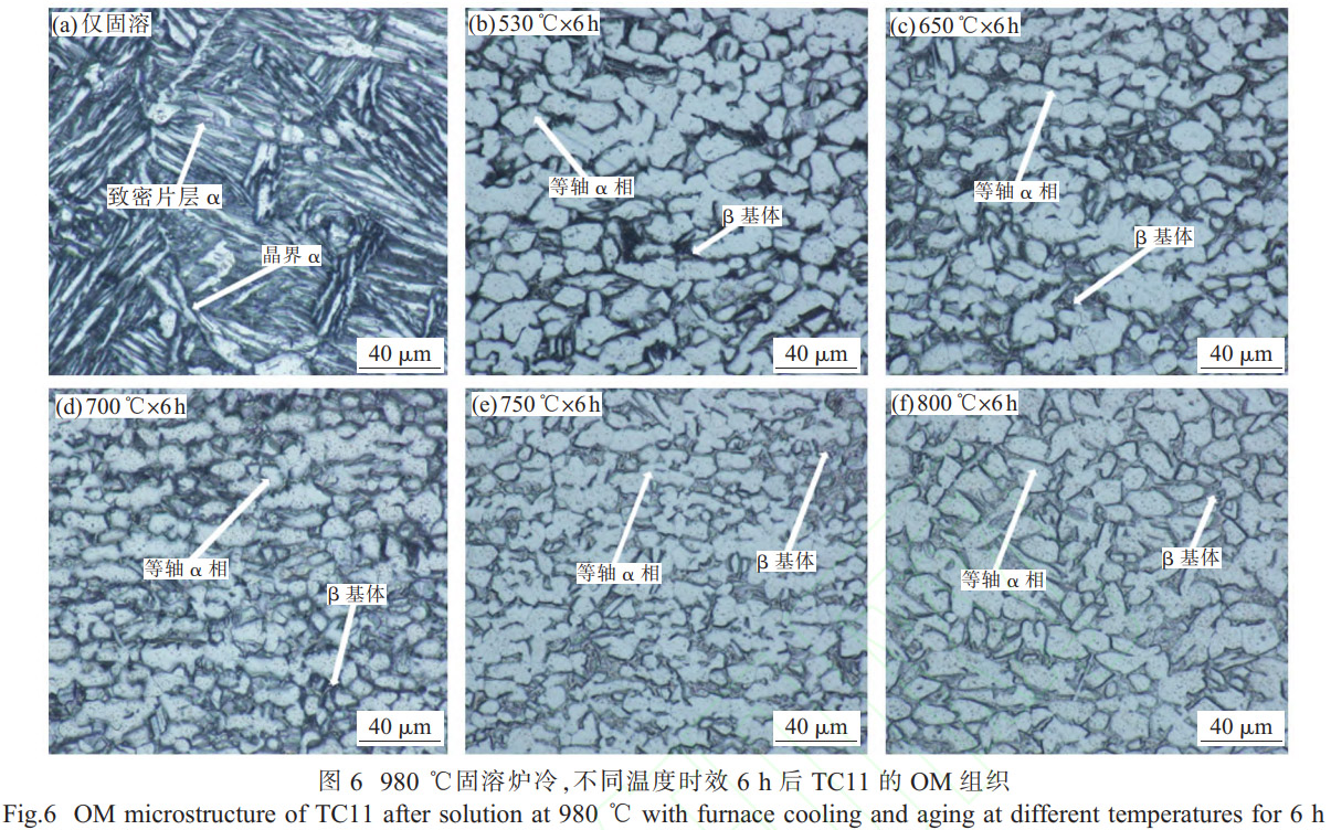 图 6、7 分别为 TC11钛合金经 980℃固溶 1h 后炉冷,随后在 530~800℃时效 6h 后的 OM 和 SEM 显微组织。图 6(a)、图 7(a)为固溶态未时效组织,随着时效温度从 530℃提升至 800℃,初生 α 相的含量和晶粒大小未发生显著变化,如图 6(b)~(f)、图 7(b)~(f)所示。定量分析组织中等轴 α 相的体积分数,其稳定在 80% 左右,几乎没有发生改变。这表明在 530~800℃的时效温度范围内,时效温度对初生 α 相的影响较小。初生 α 相的形态和体积分数主要由固溶处理工艺所决定。