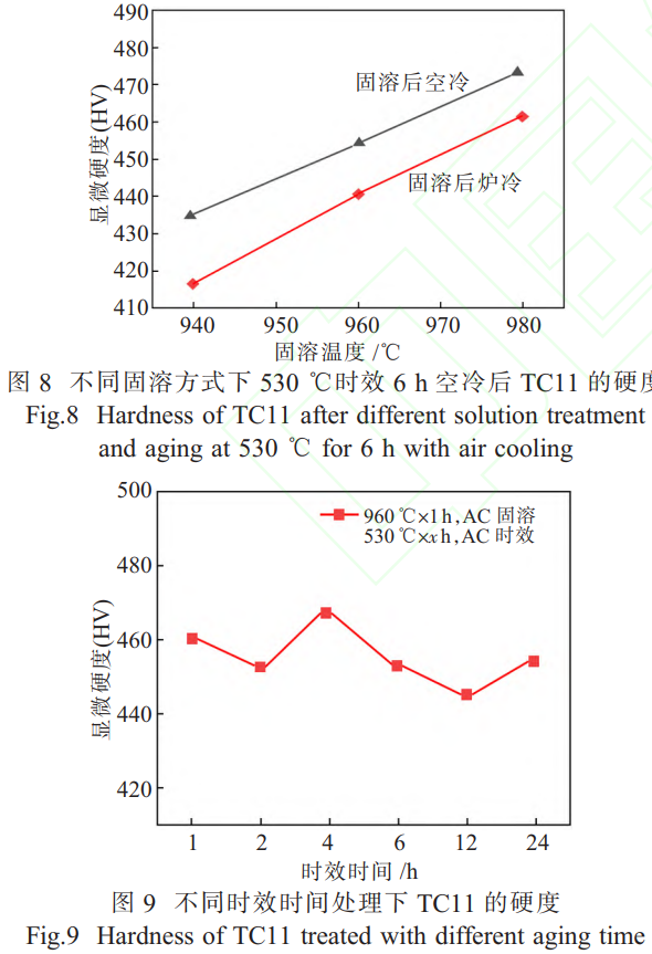 (4)固溶温度与冷却方式协同调控硬度:980℃×1h 固溶空冷 + 530℃×6h 时效空冷下,TC11硬度最大,达 472.43HV,较原始态(383.76HV)提升 23.1%;相同固溶温度下空冷的硬度比炉冷的高。