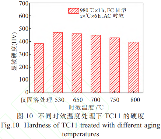 图 10 为不同时效温度处理下 TC11的硬度。在 980℃固溶 1h,炉冷 + 不同温度时效空冷下,随时效温度在 530~800℃范围内增加,TC11钛合金的显微硬度逐渐降低,硬度值从 530℃的 462HV 降至 800℃的 395HV。