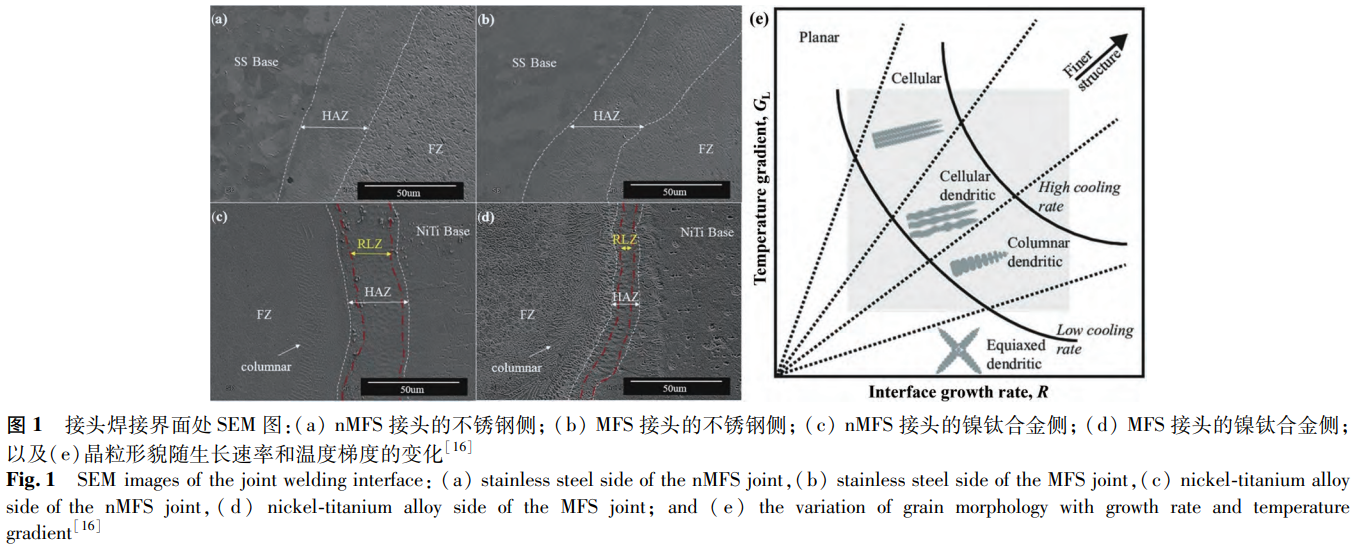 Farhang等使用激光焊连接镍钛合金与不锈钢,探究了外磁场对焊接接头的影响。其中,无外磁场辅助的焊接记为nMFS,外磁场辅助的焊接记为MFS两种接头焊缝界面处的SEM图如图1所示。从图1中可以观察到,在这两种接头中均出现从熔合区中心向热影响区的晶体形态转变的现象。在nMFS接头中,从熔合区中心至不锈钢侧,晶体形态呈现出由等轴晶粒向柱状晶再到平面晶的转变;而从熔合区中心至镍钛合金侧,晶体形态的变化则为等轴晶粒、柱状晶直至胞状晶,且其中柱状晶粒的取向与冷却方向相互平行。该研究表明,这些相变行为与界面处的温度梯度和生长速率有关,图1e对凝固过程进行了归纳。具体来说,在熔合区中心,G值较低,R值较高,促使枝晶生长形成等轴晶。在从熔合区中心向基材移动的过程中,G值和R值改变,形成柱状、胞状/平面结构。磁场对电子运动的影响改变了电子在凝固和生长过程中所携带的能量。因此,在MFS接头中观察到不同于nMFS接头的凝固现象。相较于nMFS接头,MFS接头中熔合区中心形成较细的等轴晶粒(如图1a、b所示),这是由于磁场降低G值的同时增加了R值。且熔融材料受到洛伦兹力的影响发生旋转,使原本平行于冷却方向的柱状晶粒(位于从熔合区向镍钛合金转变处)取向改变,呈随机取向(见图1d)。此外,磁场使电子运动偏移造成的热输入减少以及磁场促进熔体运动引起的冷却速率加快共同导致MFS接头的反应层区更窄。