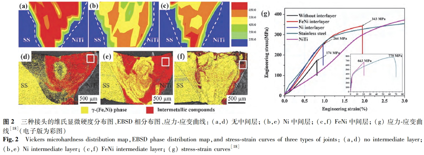 Niu等针对通过真空电子束焊接形成的三种NiTi/SS接头开展了对比评价,这三种接头分别为电子束偏移到SS侧且无中间层的接头、添加Ni中间层的接头以及添加FeNi中间层的接头。各接头的硬度分布情况如图2a-c所示,由图2a-c可知,焊缝区的硬度显著高于两种母材。这一现象的成因在于焊缝区中存在金属间化合物以及发生了固溶强化作用。通过对比硬度图与相分布(见图2d-f)发现,接头中的金属间化合物含量越多,其硬度越高。为进一步探究对其力学性能的影响,Niu等对焊接样品进行了拉伸测试,结果表明FeNi中间层接头展现出最优的拉伸性能,Ni中间层接头次之,而无中间层接头的拉伸性能最差(见图2g)。进一步观察发现,三种样品的断裂位置均处于焊缝区内靠近镍钛合金一侧。借助扫描电子显微镜(SEM)和电子背散射衍射(EBSD)技术对裂纹分析可知,在无中间层接头中,金属间化合物以Fe2Ti作为主相,Ni3Ti则呈连续网状分布于其中。裂纹径直穿过金属间化合物进行扩展,当遇到较厚的Ni3Ti相时,会出现轻微的偏转现象。由此可见,该断裂接头呈现出解理断裂的特征。在Ni中间层接头里,金属间化合物以Ni3Ti为主相,Fe2Ti呈网状分布于其中。裂纹的扩展仅仅在Fe2Ti相中发生,并且会被Ni3Ti相阻挡。因此,该接头断口表现出沿晶断裂的特征。对于FeNi中间层接头而言,Fe2Ti以柱状枝晶的形态析出,Ni3Ti分布在其枝晶之间。裂纹主要出现在Fe2Ti枝晶内部,不过会被枝晶间的Ni3Ti相阻断。这种复合结构能够有效地阻止裂纹的进一步扩展,使得断裂接头同时具备解理和韧性断裂的特征。