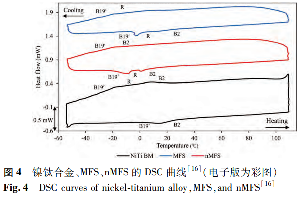 镍钛合金的形状记忆效应源于马氏体相变,这是该合金的一项关键性能。激光焊接会致使合金的显微组织发生改变,进而对马氏体相变以及逆相变过程产生作用,使得焊接接头的形状记忆效应有别于镍钛合金母材,这一点在已有研究中有所提及。鉴于此,针对焊接接头形状记忆效应开展研究极为必要,因为形状记忆合金的相变特性是评估其功能特性的重要依据之一。Farhang等运用差示扫描量热法对镍钛合金以及存在或不存在磁场的NiTi/SS接头进行了测试,测试结果如图4所示。其中,奥氏体(B2)、马氏体(B19’)以及R相通过图中的峰位得以确定,而奥氏体终止温度Ai则被用作比较不同样品之间转变温度的指标。经测试,镍钛合金的奥氏体终止温度为24.7℃,与之相比,nMFS样品的奥氏体终止温度降低了约20℃,这表明nMFS样品的功能特性发生了明显改变。导致nMFS样品转变温度降低的因素是多方面的,包括其内部存在较多的缺陷、焊接过程中冷加工性能的消除、残余应力和晶粒生长现象的出现以及Ni/Ti比的上升等。然而,MFS样品的奥氏体终止温度为24.1℃,基本保持了镍钛合金基材的转变温度水平,这意味着镍钛合金的功能特性在MFS样品中得到了有效的保留。
