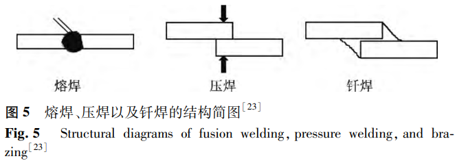 依据焊接过程所呈现出的特性,焊接可被划分为三大类别,即熔焊、压焊与钎焊,其相应的结构简图如图5所示。熔焊是指在无压力的情况下对母材进行加热,使其熔化并相互混合,在冷却后形成焊缝。氩弧焊、电子束焊、激光焊等均属于熔焊。压焊在焊接过程中必须对母材施加压力,但对加热没有要求。它是一种使材料在固态下实现原子间结合而实现连接的焊接方法。压焊可分为多种类型,如电阻焊、摩擦焊、超声波焊等。钎焊是指通过加热使焊材之间的填充金属熔化,液态钎料与固态焊材相互扩散,冷凝后形成接头的方法。目前,针对镍钛合金与不锈钢的焊接研究多聚焦于激光焊接领域。主要得益于激光焊接具备热输入量低、能量密度高以及熔合区与热影响区范围小等显著优势。
