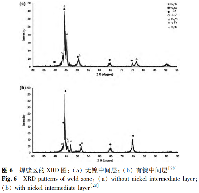 此外,添加中间层也是控制Fe-Ti等金属间化合物形成的有效方法,能够改善接头性能。例如,在直接焊接的TC4/SS接头中会产生大量Fe-Ti等金属间化合物。Liu等采用复合中间层制备TC4/SS接头,发现能够防止Fe-Ti脆性相的产生,可以在很大程度上优化接头的力学性能,具有重要的研究价值。在镍钛合金与不锈钢异种焊接方面,Asadi等研究了镍中间层对激光焊接接头的影响。通过x射线衍射(XRD)分析可知(见图6),添加镍粉后焊缝的Fe2Ti初生相转变为Ni3Ti初生相,γ相和Ni3Ti相含量增加,脆性金属间化合物含量减少。这是因为焊缝中过量的镍会造成Ti、Fe和Cr的减少,并且镍是奥氏体形成元素和γ相稳定剂,促进了γ-Fe的形成。Li等深入研究了镍中间层厚度对焊接接头产生的影响。研究表明,随着镍层厚度逐步递增,接头内的镍含量相应上升,脆性金属间化合物减少,进而使得接头性能得以提升。当镍中间层的厚度增长至50μm时,接头的抗拉强度以及断裂伸长率达到最大值,分别为372MPa和4.4%。然而,倘若镍中间层厚度继续增加,接头内部会形成更多的Ni3Ti相,同时会产生气孔与缩孔等缺陷,最终致使接头性能下降。这一研究结果与周海宽等等得出的结论相互吻合、保持一致。因此,为获得性能优异的焊接接头,需要选择合适的中间层厚度,即焊缝成分。此后,Li等研究了铜中间层、钴中间层、38Zn-61Cu中间层对NiTi/SS接头的影响,并在38Zn-61Cu中间层的研究中增加激光偏移技术,在接头处形成三个区域,即SS侧熔合区、未熔化SS以及NiTi/38Zn-61Cu/SS形成的扩散焊缝。在这些研究中观察到类似的现象,即通过抑制脆性金属间化合物的形成来改善接头的力学性能。同时,铜中间层的使用还可以消除热应力产生的裂纹,但铜中间层过厚会形成富铜球,其与周围基体的结合相对较弱,有利于裂纹形核和扩展。