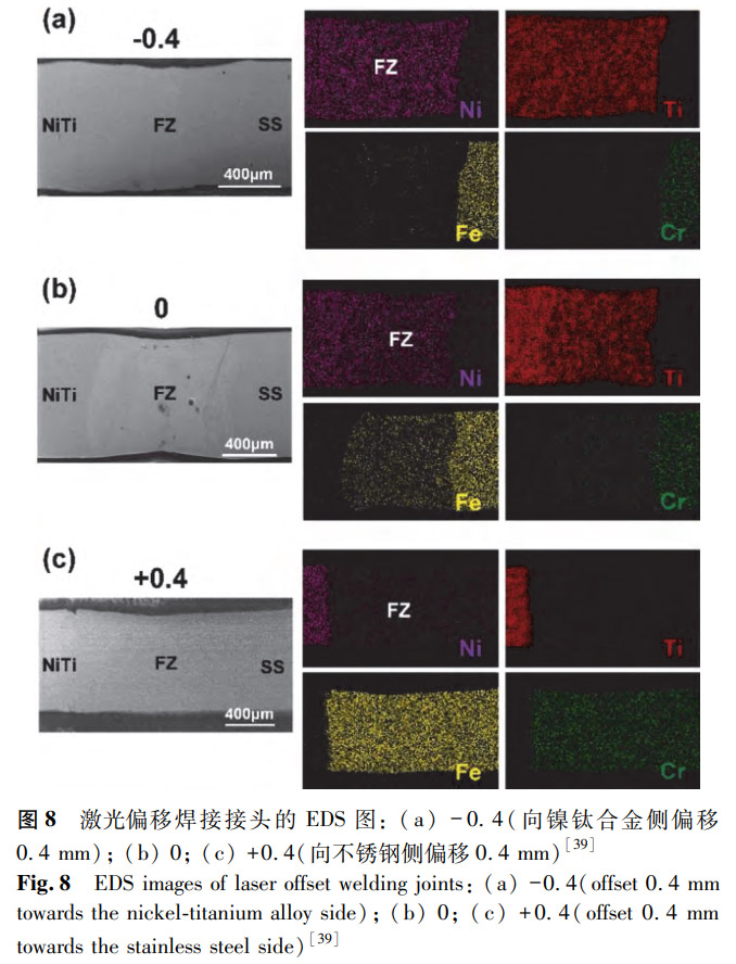 Zhang等对激光偏移焊接技术进行了研究。激光偏移可以影响元素扩散,改变焊缝中的元素含量。如图8所示,+0.4(向不锈钢侧偏移0.4mm)接头的焊缝中主要为Fe和Cr元素,Ni和Ti元素的含量很少。Fe-Ti金属间化合物被认为是削弱NiTi/SS接头质量的主要因素。因此,+0.4(向不锈钢侧偏移0.4mm)接头中Ti元素的减少使脆性金属间化合物减少,从而导致接头硬度的显著降低以及拉伸性能的改善。类似地,Shamsolhodaei等通过激光偏移焊接方法对超弹性镍钛合金丝与不锈钢丝进行连接,发现激光偏移改变了接头焊接区的元素分布,提升了接头性能。
