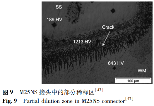 除了选择合适的焊接工艺参数外,还可以通过加入中间层的方法来改善焊接质量。Oliveira等以镍钛合金和Inconel625为填充材料,探究了不同填料以及热处理对氩弧焊焊接接头的影响。在接头中观察到通过外延凝固形成的枝晶,枝晶的生长导致枝晶间空隙中存在溶质排斥,并可能形成金属间化合物,因此,裂纹主要沿着枝晶间区域形成。无序晶格减缓了位错的迁移率和原子扩散过程,导致结构中内应力的形成,提升了其硬度和脆性。相比于镍钛合金填料,使用Inconel625填料的接头通常具有较高的抗拉强度,最佳可达到286MPa。对于未经焊后热处理的样品,在焊缝和母材之间的熔合线处形成了清晰界面区域,即部分稀释区(见图9),该区域会析出金属间化合物。在进行热处理之后,焊接接头中不存在部分稀释区。且焊后热处理减小了接头中的残余应力,使接头具有更高的力学性能。