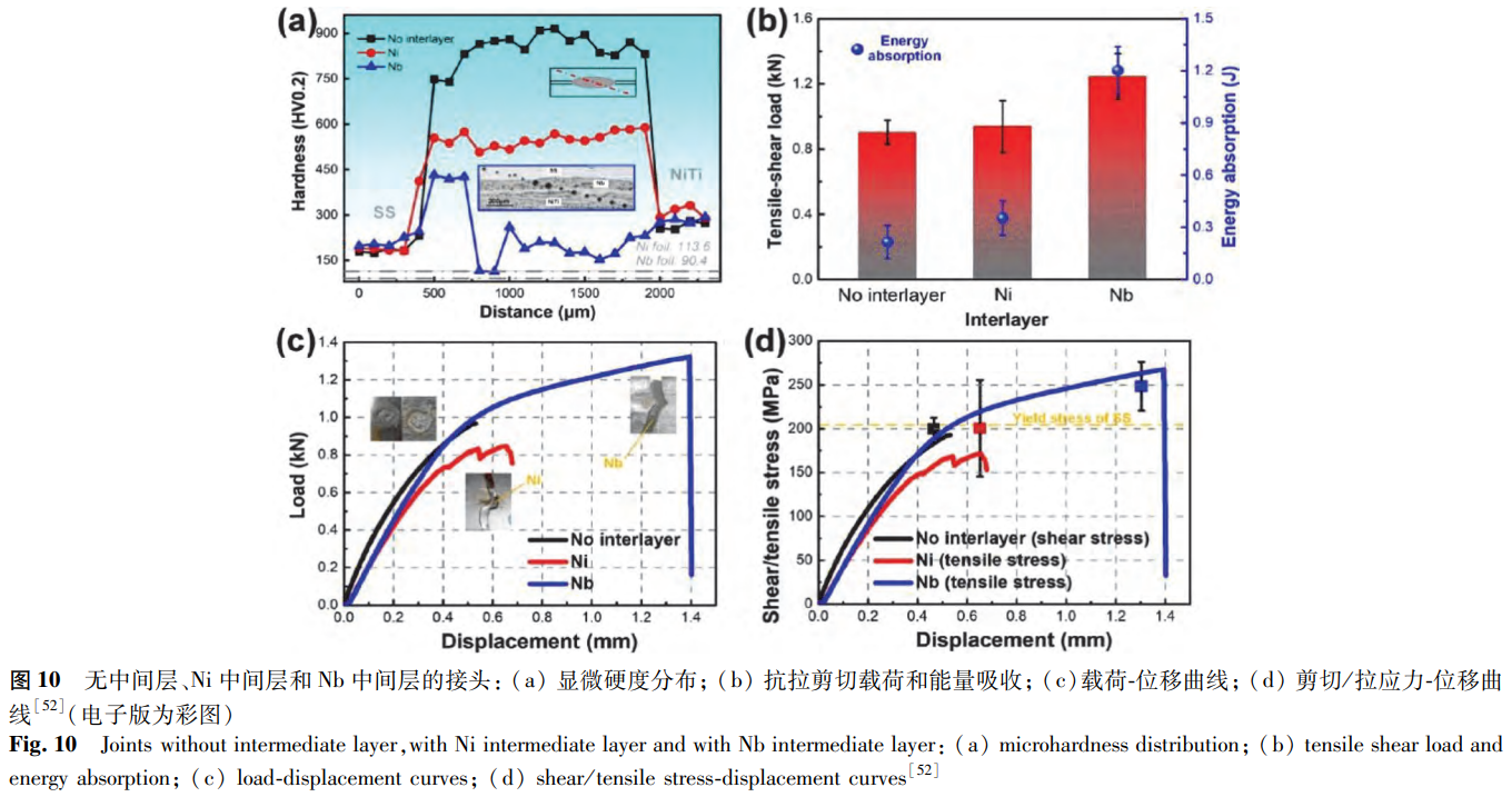 通过替换有害相和限制混合这两种方法可以控制焊接接头中的金属间化合物。为此,Zhang等选择了低熔点Ni和高熔点Nb作为中间层。在Ni中间层接头中,随着脆性Fe2Ti相的替换,以Ni3Ti为主的焊缝具有更好的延展性。但镍的蒸发会导致大气孔、缩孔、裂纹的产生,使有效连接面积减小,造成接头强度降低。在Nb中间层接头中,熔合区被未熔融的Nb分离,这抑制了不同熔融金属间的混合,并在界面处形成低脆性的含铌共晶结构。该接头强度在断裂载荷方面提高了38%,在能量吸收方面显著提高了460%,如图10所示。由此可知,高熔点中间层具有实现可靠NiTi/SS电阻点焊接头的巨大潜力。