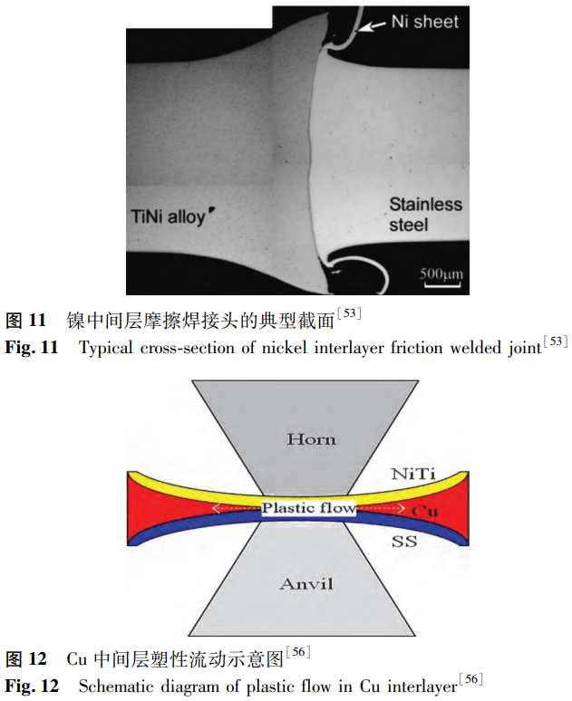 在超声波焊接过程中,材料不会熔化,这抑制了过渡相的形成,适合异种金属的焊接。其核心是超声振动,高频超声振动有助于促进焊接时材料的声软化。在实际等效软化效果的条件下,热软化所需的热能输入是超声能量的107倍。Chen等发现未添加中间层的NiTi/SS超声波点焊接头具有机械互锁结构,抗拉强度可达到404.71N。Ao等制备了具有Cu中间层的NiTi/SS超声波点焊接头,并研究了不同焊接能量输入对接头的影响。研究发现,焊接时的接触压力不均匀导致Cu中间层发生塑性流动(见图12),使接头的焊接界面呈现出NiTi/Cu/304SS界面和NiTi/304SS界面两种类型。在不同能量输入下,异种接头的两个界面处均未发现金属间化合物。在性能方面,平均拉伸剪切载荷先增后减,在750J时达到690N的最大值。这是因为随着能量输入的增大,热输入增加,材料软化,铜中间层塑性变形,使得结合区扩展到整个界面,接头性能显著提升。当能量输入过大时,由于铜中间层的断裂,镍钛合金与不锈钢直接接触,接头性能降低。Chen等使用Al中间层进行了相似的研究,铝中间层的塑性流动也产生了双界面。不同的是,焊接能量较高时,界面处会形成Fe4Al13脆性相。当焊接能量适中、界面机械联锁程度高、元素扩散距离长、不存在连续脆性相时,接头性能最佳。