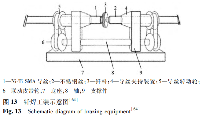 阎开婷等公开了一种血管内镍钛合金导丝、导丝焊接工装及导丝焊接方法。焊接工装如图13所示,在氩气保护气氛下,利用夹具连续转动线材进行激光小光斑多点环绕加热,使钎料熔化包覆在阶梯状端头上,完成镍钛合金与不锈钢的端部连接。