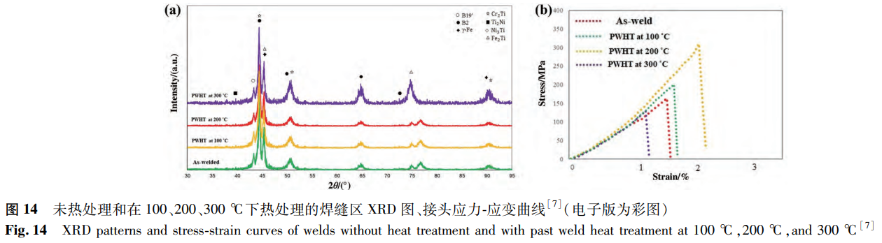 Asadi等研究了焊后退火温度对激光焊接NiTi/SS接头的影响。SEM结果显示,经过100℃和200℃的退火后,接头的显微组织没有明显变化。而在300℃退火的接头中观察到较大的枝晶结构。相组成方面,相较于无焊后退火处理的接头,100℃和200℃的退火处理对物相无明显影响,但300℃的热处理会导致金属间化合物增加(见图14a)。因此,焊接接头的硬度和拉伸性能均随退火温度的升高而改善,但退火温度达到300℃时力学性能恶化。如图14b所示,200℃接头具有最高的抗拉强度,其值高达310MPa,是未热处理接头抗拉强度的1.91倍。而300℃接头的抗拉强度仅为129MPa,低于未热处理接头。类似的研究也呈现出相同的结果,经过200℃焊后热处理的样品的抗拉强度由213MPa提高到393MPa,耐腐蚀性能也得到提高。