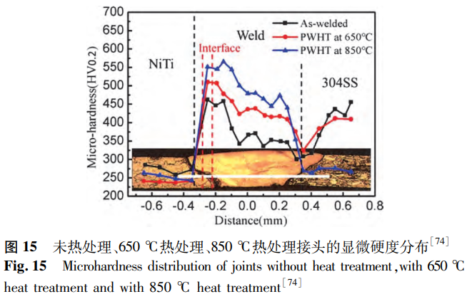Chen等研究了焊后退火工艺对以镍为中间层的NiTi/SS接头的影响。研究表明,未热处理接头的NiTi/Ni界面可分为两层,随着焊后热处理温度的升高,NiTi/Ni界面和焊缝处析出越来越多的Ni3Ti金属间化合物,在850°C接头的NiTi/Ni界面中已全部转变为Ni3Ti相。这使得所有接头的硬度在NiTi/Ni界面达到最大,且焊接区硬度随着退火温度的升高而提高,如图15所示。由于焊后热处理使接头组织逐渐趋于均匀化,焊缝的最大硬度与平均硬度之间差值减小,接头的抗拉强度提高,在850℃接头中达到643MPa的最大值,是未热处理接头抗拉强度的2.12倍。因此,焊后热处理可以改善焊接接头的性能,但为了达到预期效果,需要选择合适的热处理工艺。