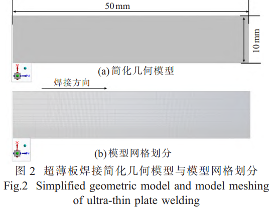 利用 ANSYSFLUENT软件建模模拟焊接过程,热源为高斯热源 [9],边界条件设为自然对流。图 2为同种材料超薄板焊接简化几何模型与模型网格划分。100μm厚TC4超薄板P-MPAW焊接时,如图1所示的板材外部有工装夹具,如果按照实际焊接条件建模将增加数值计算时间和影响结果的准确性,因此将三维几何模型简化(图2(a)),简化后的超薄板尺寸为50mmx10mmx0.1mm。模型网格划分使用六面体网格划分法(图2(b)),采取焊缝中心附近2mm内网格密集,板厚方向与焊接方向网格大小均为0.1 mm,远离焊缝中心区域网格大小均匀递增的原则,最远端网格大小为0.8mm,总网格数量为17500。
