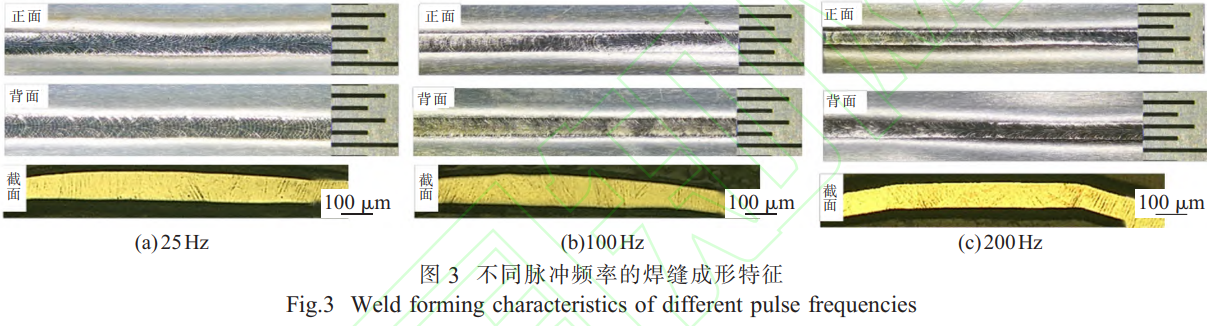 100μm厚TC4钛合金超薄板P-MPAW在占空比30%、基值电流0.8A时,不同脉冲频率的焊缝成形特征如图3所示。结果表明,P-MPAW实现了不同脉冲参数下100μm厚TC4钛合金超薄板的单面焊双面成形工艺,而且焊缝成形一致性良好。当脉冲频率为25Hz时,焊缝呈现为鱼鳞状,且均匀连续未出现气孔、裂纹等焊接缺陷;当脉冲频率分别为100、200Hz时,焊缝均呈现为光滑连续焊缝。当脉冲频率增大时在微束等离子弧的高频压缩特性的作用下,使得焊缝变窄,因此脉冲频率为200Hz时焊缝正面与背面宽度相较于脉冲频率为25、100Hz时的更窄,焊缝截面宽度也更小。