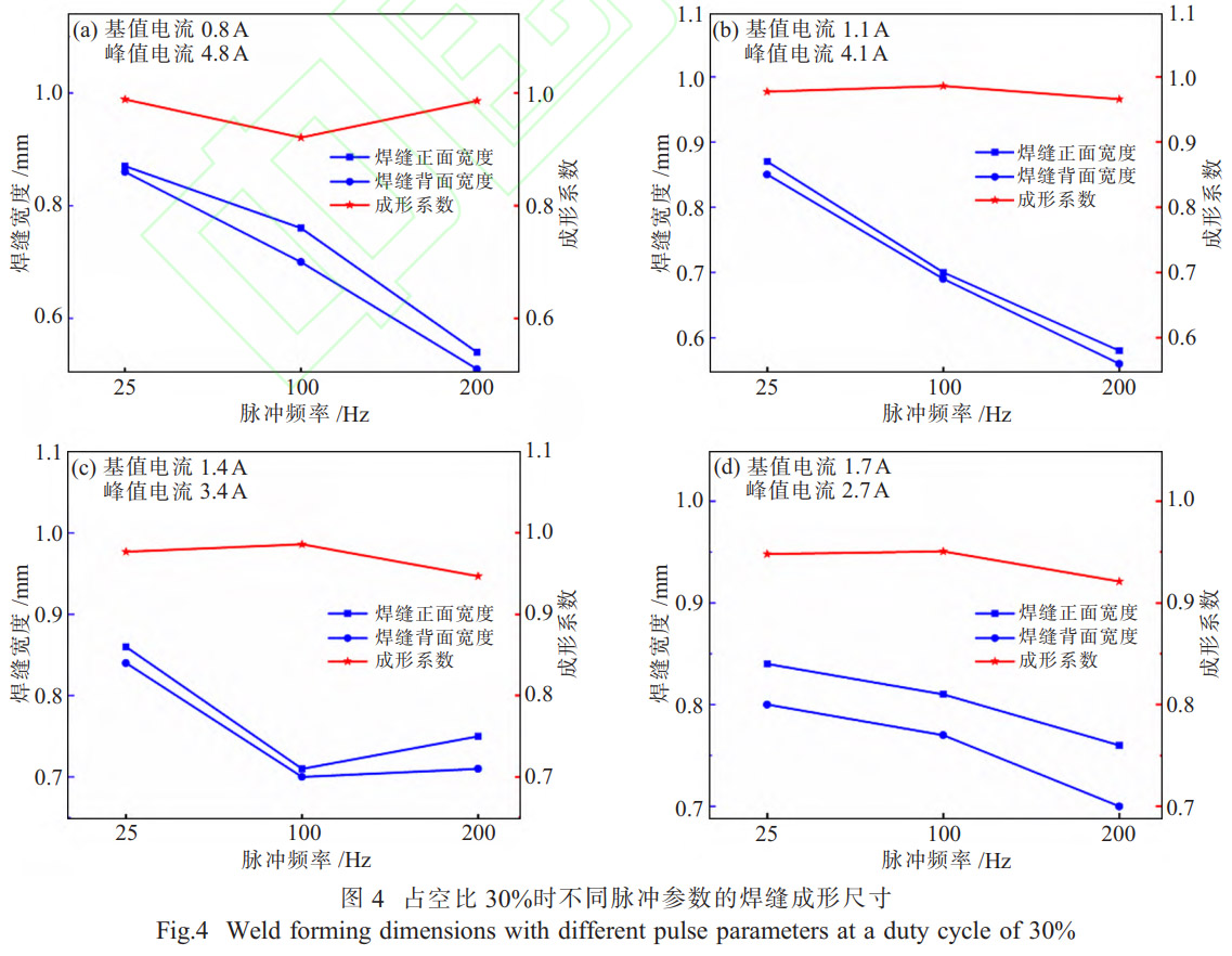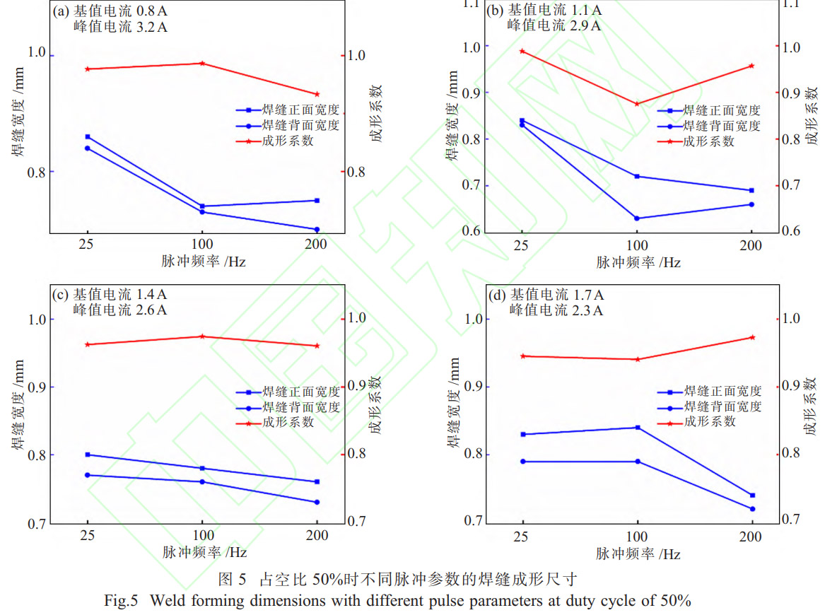 图5为占空比50%时不同脉冲参数的焊缝成形尺寸。结果表明,在平均电流固定不变为2A、占空比50%时,不同脉冲参数下,焊缝正面宽度大于焊缝背面宽度,焊缝成形系数趋近,焊缝成形稳定;随着基值电流的增大,焊缝宽度逐步变小;随着脉冲频率的增大,焊缝宽度逐步变小。在平均电流相同、占空比不变的情况下,占空比为30%时的焊缝宽度大于占空比为50%时的焊缝宽度,其原因是当平均电流、占空比、基值电流、脉冲频率不变的情况下,占空比30%时的峰值电流大于占空比50%时的峰值电流,峰值电流越大,电弧能量集中,电弧力越大,熔深和熔宽增加,因此焊缝宽度增大。