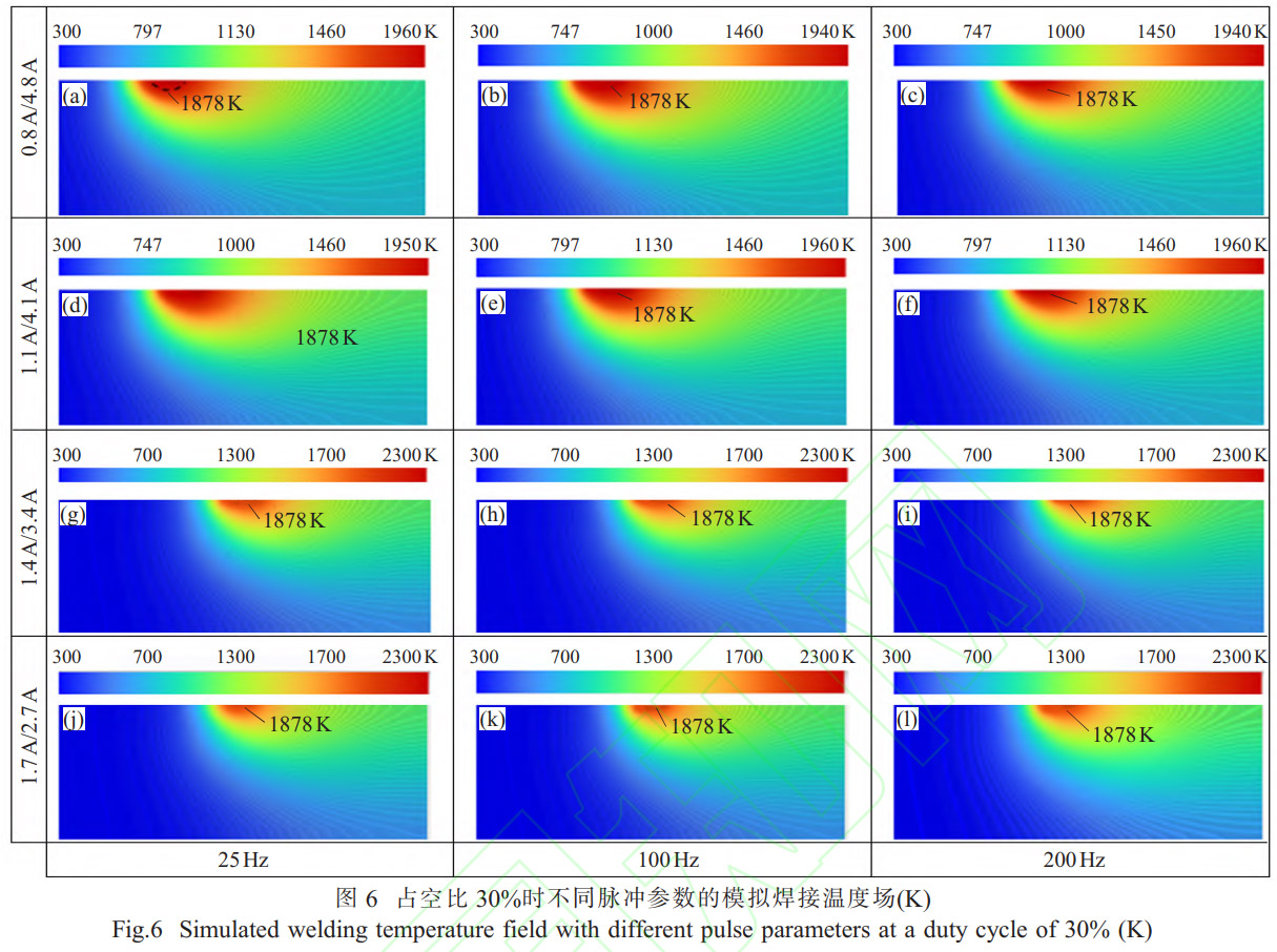 图6为占空比30%时不同脉冲参数的模拟焊接温度场。图6(a)~(c)分别为占空比30%、基值电流0.8A不变时,脉冲频率分别为25、100、200Hz时的模拟焊接温度场,图6(a)、(d)、(g)、(j)分别为占空比30%、脉冲频率25Hz不变时,基值电流对应为0.8、1.1、1.4和1.7A时的模拟焊接温度场。结果表明,当占空比和基值电流保持不变的情况下,随着脉冲频率的增大,高于TC4钛合金熔点(1878K)的温度场面积有所减小;当占空比和脉冲频率保持不变的情况下,随着基值电流的增大,高于TC4钛合金熔点的温度场面积亦有所减小。在模拟整个焊接过程中发现,焊接温度场从稳态到非稳态再过渡到稳态,模拟焊接温度场热源附近温度最高,远离热源,温度逐渐降低,热源正前方等温线密集。说明该区域温度梯度较大,热源后方形成有彗尾状温度场,温度梯度较小,因此等温线较为分散。