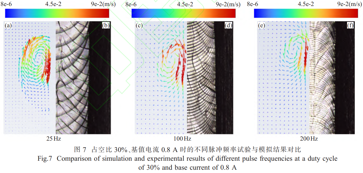 图7为占空比30%、基值电流0.8A时的不同脉冲频率试验与模拟结果对比。。其中图7(a)、(c)、(e)分别为脉冲频率为25、100、200Hz时数值模拟焊接熔池流场;图7(b)、(d)、(f)分别为脉冲频率为25、100、200Hz时,共聚焦显微镜观察到的焊缝形貌。结果表明,熔池流场整体呈椭圆形,在基值电流和脉冲电流的交替作用下,对熔池形成了一定搅拌作用,使焊缝液态金属顺时针流动。其中,热源中心位置流速最大,结合温度场分析,熔池前方温度梯度大,金属未熔化,熔池较窄,液态金属流动受阻使得流速较大。熔池后方温度梯度小,液态金属处于冷却凝固过程,熔池较宽,液态金属堆积导致流速较慢,因此流场整体呈椭圆形。对比图7(a)、(c)、(e)可以明显看出,模拟熔池轮廓与试验所得到的焊缝形貌基本吻合。随着脉冲频率的增大,模拟熔池流场范围变小,焊缝宽度也随之减小,与工艺试验结果一致。随着脉冲频率的增大,液体金属流速变小,逐渐趋于平稳,有利于焊缝成形,焊缝从鱼鳞焊缝逐渐过渡至连续焊缝。