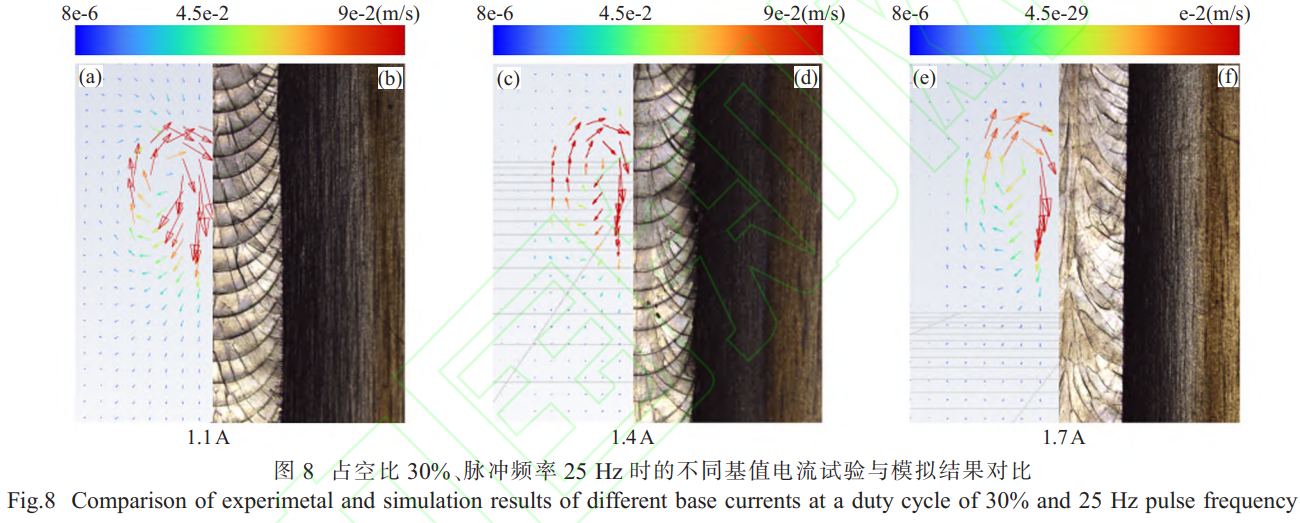 图8为占空比30%、脉冲频率25Hz时的不同基值电流试验与模拟结果对比。图8(a)、(c)、(e)分别为基值电流1.1、1.4、1.7A时数值模拟焊接熔池流场;图8(b)、(d)、(f)分别为基值电流1.1、1.4、1.7A时,共聚焦显微镜观察到的焊缝形貌。对比图8(b)、(d)、(f)可以明显看出,模拟熔池轮廓与试验所得到的焊缝形貌基本吻合,随着基值电流的增大,模拟熔池流场范围变小,焊缝宽度也随之减小,与工艺试验结果一致。随着基值电流的增大,峰值电流与基值电流差值变小,液体金属流速变小,逐渐趋于平稳。