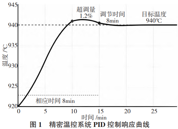 从图1可知,精密温控系统在目标温度设定成940℃时展现出优异动态特性,系统响应时间为8min且超调量仅1.2%,远远优于传统控制系统15min响应时间和5%超调量的性能指标,温度稳定之后波动幅度被控制在±1.5℃范围内,满足±2℃的精度要求。