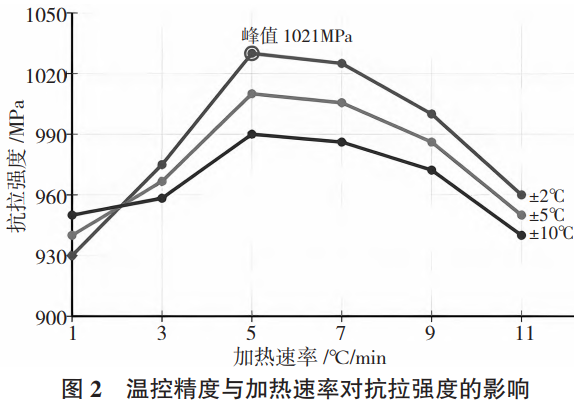 温控参数优化研究显示加热速率与温控精度存在协同效应,当加热速率控制在 3~7C/min时,温控精度对组织性能影响最为显著,通过开展系统性的参数优化实验揭示了温控技术的性能提升规律,如图 2所示。