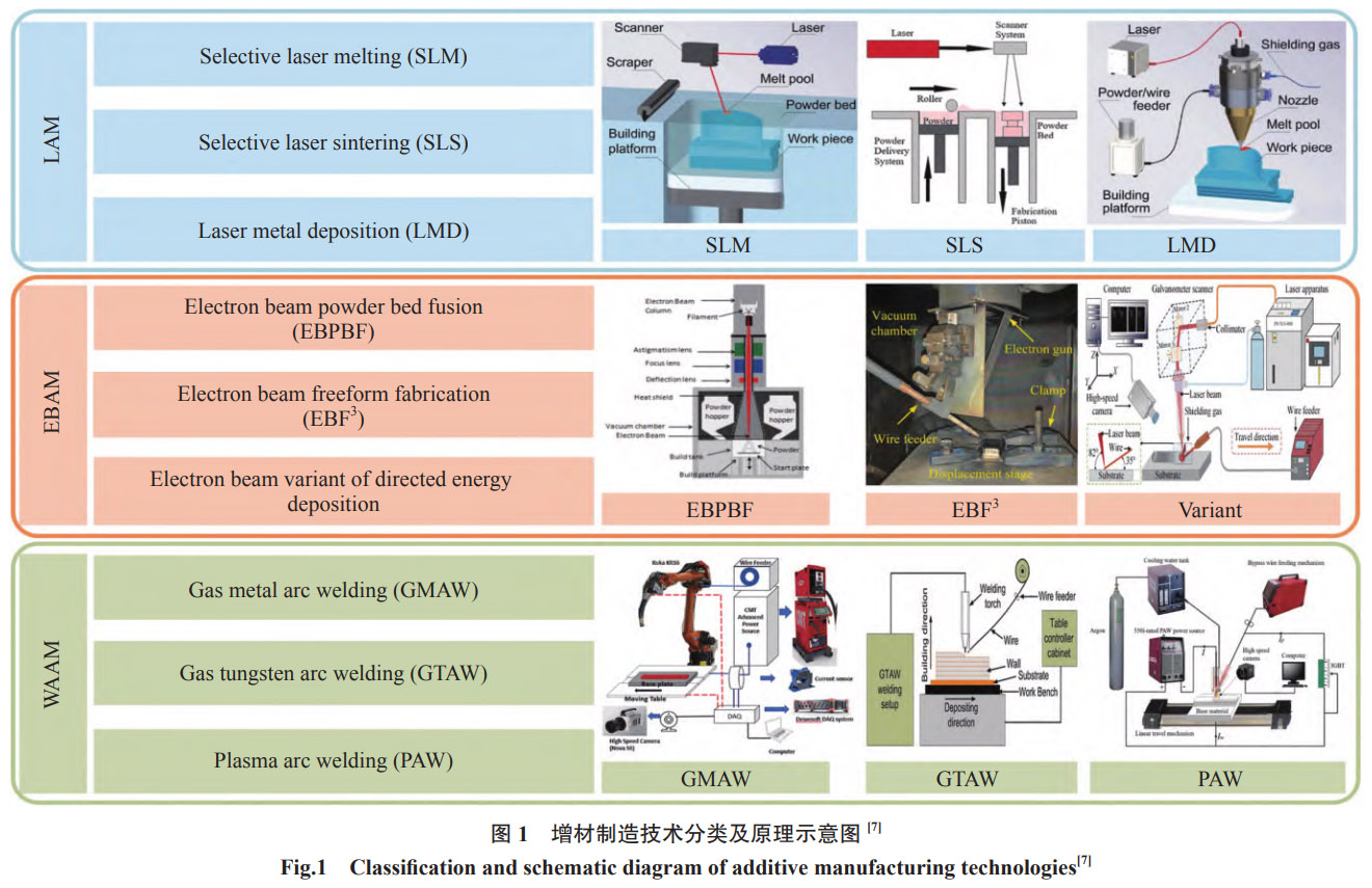 增材制造技术是一种新兴的自下而上的制造技术,与传统的减材/等材制造截然不同,其核心原理主要在于“分层制造,逐层叠加”。在航空航天领域,常见的增材制造技术主要包括激光增材(LAM)、电子束增材(EBAM)和电弧熔丝增材(WAAM)3种类型,如图1所示[7],其中每种类型又包含不同的专业技术。此外还有学者概括了一些金属增材制造的新兴技术,如材料挤出、粘合剂喷射、粉末床熔融和定向能量沉积等[8]。这些增材制造技术将复杂的三维制造问题分解为简单的二维层面问题的叠加,从而实现“自由制造”,也在航空航天、医疗、模具等领域展现了一定的应用前景。