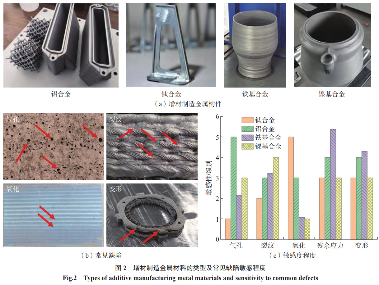 在航空航天领域,增材制造金属材料凭借个性化成形、减重降耗的优势,成为构件制造革新的核心支撑。图2展示了该领域增材制造金属材料的类型、常见缺陷及敏感程度。铝合金以低密度和良好成形性,重点用于机身蒙皮[9]、卫星支架[10]、无人机机身框架[11]等轻质构件,未来将聚焦突破2系、7系硬铝热裂纹难题,开发含Sc、Zr等元素的高强铝合金,目标适配机翼承力框架、起落架舱门等更高强度需求部件,适配大型客机轻量化升级需求[12]。钛合金因高比强度、优异疲劳性能及高温稳定性,成为航空航天承力与高温构件核心材料,目前可通过PBF-LB工艺制造发动机叶片[13],使用EBAM工艺制造燃烧室[14],后续将重点攻关Ti-Al金属间化合物的增材制造技术,突破650℃以上高温应用瓶颈。铁基合金以成本优势填补中低强度构件需求空白,马氏体时效钢可用于制造飞机起落架辅助支撑[15]、卫星结构连接件[16]等对强度和韧性有基础要求的部件,不锈钢则适配航天器燃料储箱管路[17]、航空设备壳体[18]等耐腐蚀场景,随着成分优化与工艺改进,将进一步降低航空航天中低端构件制造成本。镍基合金通过PBF-LB可实现航空发动机燃烧室复杂冷却通道设计,提升散热效率,随着新型高温合金的增材制造研发,将突破1200℃以上极端环境应用限制。