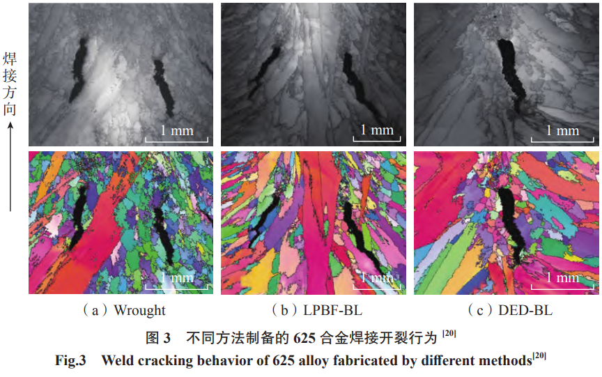 其次,增材制造金属的裂纹敏感性亦极高。对于增材制造材料,快速凝固特性导致的元素偏析、柱状晶取向与已有的母材缺陷会显著提高焊接凝固和液化裂纹敏感性。凝固裂纹(图3[20])通常在凝固末期因共晶/低熔点相富集、晶界弱化及收缩不连续产生,而液化裂纹则因热影响区在热循环中晶界局部区域短时液化导致界面脆弱[21]。此外,经历增材和焊接制造后的接头应力分布极为复杂,与随后的热处理往往会使得残余应力、相变体积效应与强化相析出共同作用,降低基体塑性,从而在热处理或服役加载下诱发应变时效裂纹[22]。