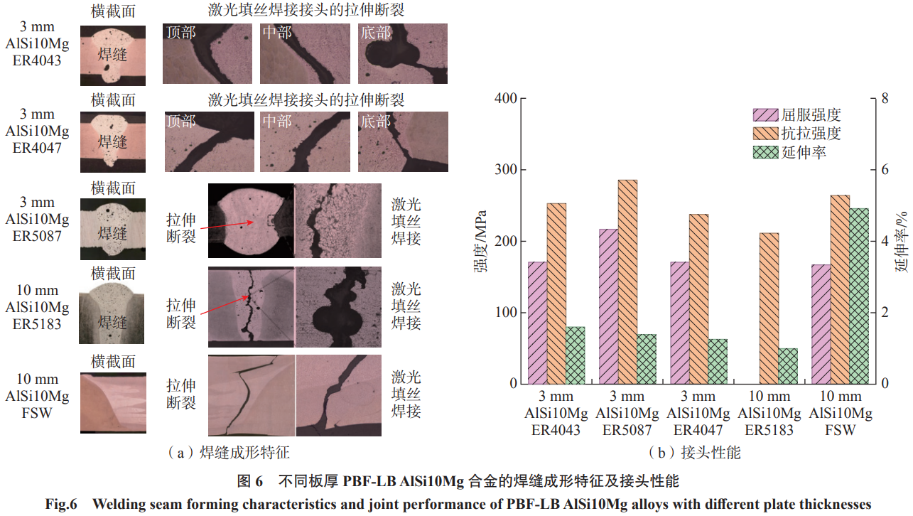 增材制造铝合金中的孔隙缺陷被认为是影响焊缝气孔率的关键因素之一。如图5所示,Zhang等[35]发现PBF-LB成形的AlSi10Mg合金比铸态孔隙敏感性高,而且气孔是其成形焊缝的主要缺陷。对此,Sun等[36]进一步研究发现PBF特殊的制造过程会导致AlSi10Mg本身存在固溶的氢和显微氢气孔,在焊接时会大量聚集从而产生气泡。针对该类气孔问题,Wang等[37]采用激光金属沉积(LMD)技术将粉末逐层熔化堆积在带有坡口的AlSi10Mg母材之间以形成焊缝,通过减少母材熔化量来控制溶入熔池的氢含量,从而降低形成气泡的风险。在此基础上,张钧翀等[38-39]采用预留对接间隙结合摆动激光焊接的方法,不仅从降低母材熔化率的角度控制氢的溶解,而且摆动光束的搅拌作用也有利于气泡的及时溢出。针对3mm厚AlSi10Mg合金,经过优化工艺参数并选择合适的填充焊丝,显著降低了焊缝气孔率,提高接头抗拉强度至286MPa(图6);此外,通过研究发现,与激光填丝焊相比,搅拌摩擦焊在焊接AlSi10Mg厚板方面更具优势,接头强度可提升25.3%,达到264MPa。