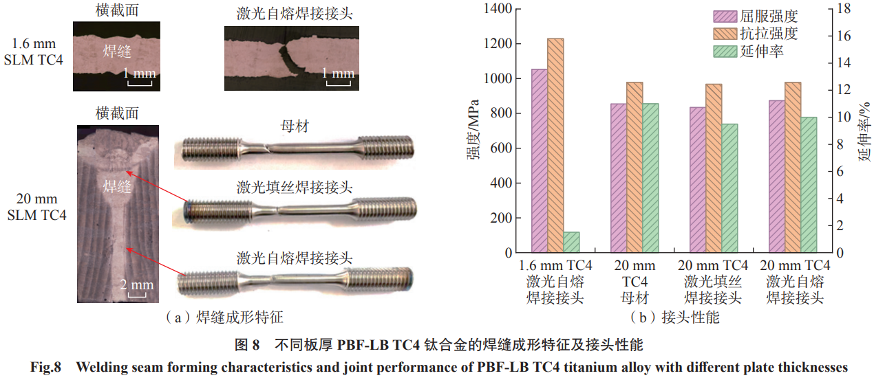 增材制造钛合金(TC4、TC11、TA15等)具有卓越的机械和耐蚀性能,且气孔、裂纹等焊接缺陷敏感性均低于铝合金。由于焊接性能优良,该合金对焊接工艺适应性较高,可采用熔化焊、固相焊等多种焊接方法连接。谢辉等[45]采用电子束焊接增材制造TC4,发现焊缝区的强度高于母材区,拉伸试样断于母材区一侧。覃佩婷[46]发现采用摩擦焊技术可以成功焊接EBM TC4钛合金且不恶化材料的力学性能,焊接接头拉伸断口呈韧性断裂特征。如图7所示,Hu等[47]采用TIG焊接方法研究了冷金属过渡(CMT)增材制造TC4合金的接头组织特征,发现焊缝组织由等轴β晶粒组成且没有择优取向。王猛等[48]发现与锻造TC11相比,增材制造TC11的激光焊接接头强度更高,焊接性更好。本团队采用激光焊接技术成功地实现了1.6mm与20mm两种厚度PBF-LB TC4合金的无缺陷高质量焊接,焊缝形貌及接头性能如图8所示。对于1.6mm薄板,采用激光自熔焊即可获得无气孔无裂纹的焊缝,其接头强度优异,室温抗拉强度与屈服强度分别达到1229MPa和1053MPa,但断后伸长率较低(1.5%)。由于该工艺方法无填充材料,导致焊缝的有效承载面积降低,促使拉伸试样沿焊缝区域发生断裂。对于20mm厚板,采用“激光自熔焊+激光填丝焊”的焊接工艺,不仅有效地保障了接头成形质量,而且通过减少焊接道次显著提高了焊接效率。拉伸测试结果表明,自熔焊和填丝焊区域的接头强度均高于母材(979MPa),试样沿母材区断裂,有力印证了该工艺下焊接接头的强度优势。