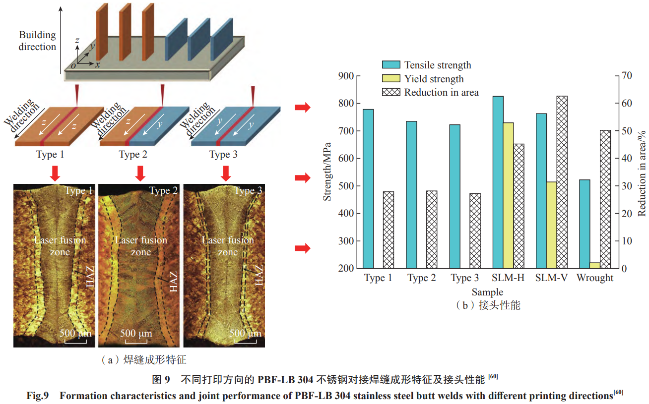近年来,增材制造铁基合金的焊接研究逐渐成为材料与制造领域的热点。目前,研究对象主要集中在合金钢和不锈钢等常用工程铁基合金,原因在于其广泛的工业应用背景及复杂热历史导致的各向异性和微观缺陷问题。增材制造制备的铁基材料通常存在气孔、未熔合区、粗大晶粒及成分非均匀等缺陷,这些缺陷会显著影响焊接接头的力学性能和服役可靠性,因此选择合适的焊接方法对于修复母材缺陷、改善接头性能具有重要意义。针对增材制造铁基合金的焊接未熔合等缺陷的研究,刘鑫泉等[56]发现,对于小尺寸粉末(小于25μm)增材制造得到的低活化铁素体/马氏体钢板(RAFM),激光焊接能够有效修复增材制造过程中遗留的道间未熔合缺陷,显示出激光焊在高精度修复和局部热控制上的优势。Mohyla等[57]研究了PBF-LB制备的AISI316L不锈钢,指出母材中存在的气孔是导致TIG焊接接头力学性能下降的主要原因,尤其是在热影响区附近,试样在屈服前发生局部断裂,这表明母材缺陷控制对焊接性能至关重要。Mokhtari等[58]通过激光焊接获得了PBF-LB AISI316L和冷轧 AISI316L的无缺陷焊缝,但两者焊缝组织存在明显差异;PBF-LB AISI316L熔合区存在外延生长现象,而冷轧AISI316L的熔合区则由奥氏体孪晶及等轴晶粒的优先取向生长所形成,这表明母材制备方式对焊缝晶粒取向和微观结构具有显著影响。Casalino等[59]采用激光-电弧复合焊方法焊接PBF-LB AISI316L,发现由于PBF-LB过程中形成的细小晶粒及局部元素沉淀,熔合区靠近PBF-LB一侧晶粒取向呈随机分布,表明复合焊接方法在调控晶粒结构上具有潜力。如图9所示,Yang等[60]研究了PBF-LB304不锈钢的各向异性对焊接性能的影响,结果表明,沿着PBF-LB母材沉积方向焊接时,焊缝形成的细小枝晶结构能够改善接头的拉伸性能。