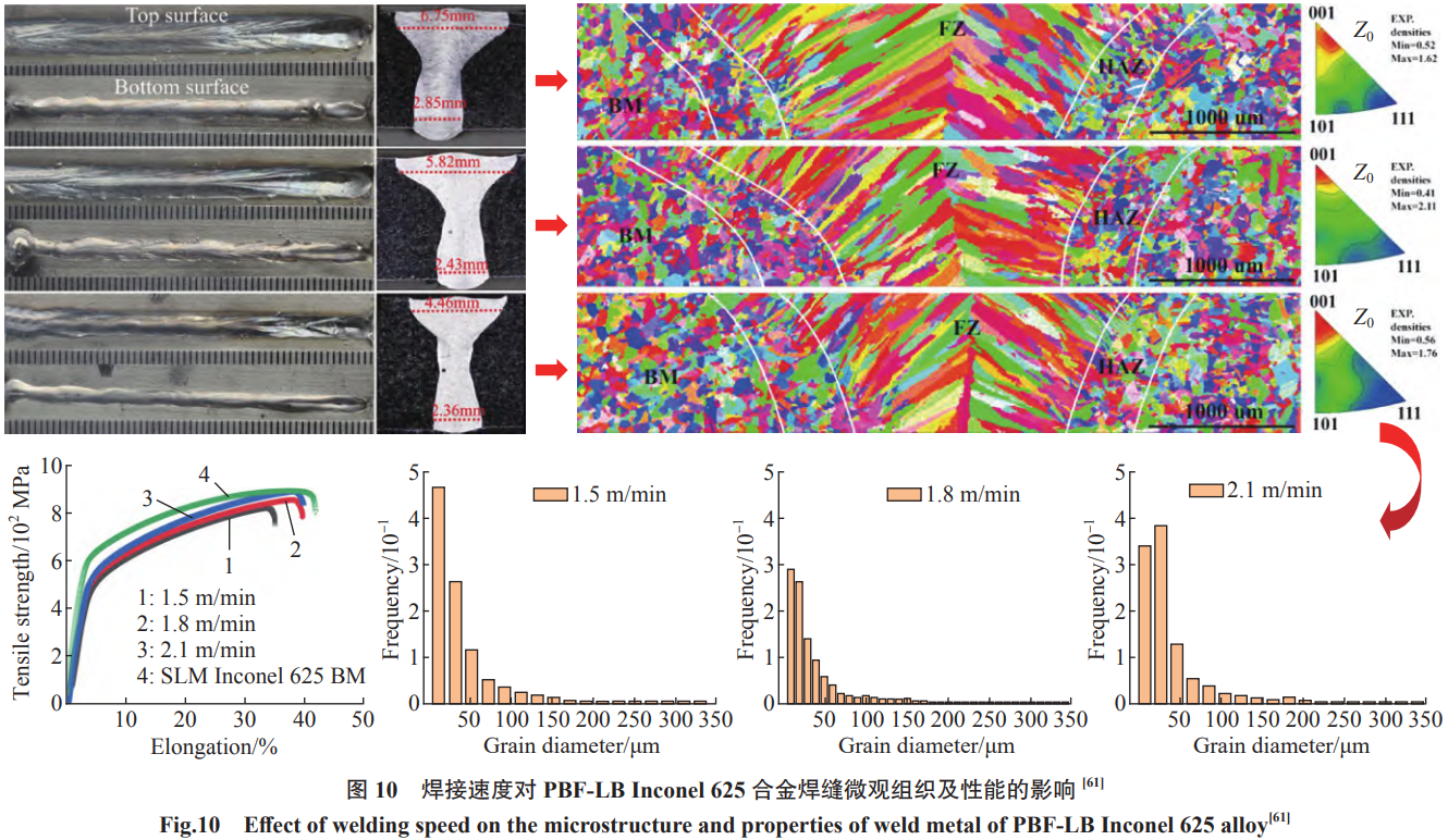 增材制造镍基合金的焊接研究热点也主要集中在焊接工艺适用性、焊缝组织特征及演化规律、气孔及裂纹缺陷等方面,涉及的焊接方法主要以激光焊接为主。Hong等[61]研究了激光焊接速度对PBF-LB Inconel 625合金接头微观组织的影响,结果发现,随着焊接速度的增加,焊缝区晶粒尺寸和高角度晶界(HAGB)的比例减小,而拉伸强度和延伸率得到了提高,如图10所示。Hu等[62]发现 PBF-LB Inconel 625激光焊接接头在815℃的拉伸强度高于母材,而由柱状晶组成的焊接区的抗拉断裂性能竟然优于原始的具有等轴晶粒的PBF-LB合金,因而认为激光焊接是连接该材料的高效方法。Zhang等[63]发现PBF-LB Inconel 625激光焊接试样的疲劳和蠕变疲劳性能均优于未焊接试样,焊缝区晶界碳化物的强化效应及无明显焊接缺陷促使了焊缝的性能提升,再次印证了激光束焊接在连接PBF-LB Inconel 625方面具有很大的优势。