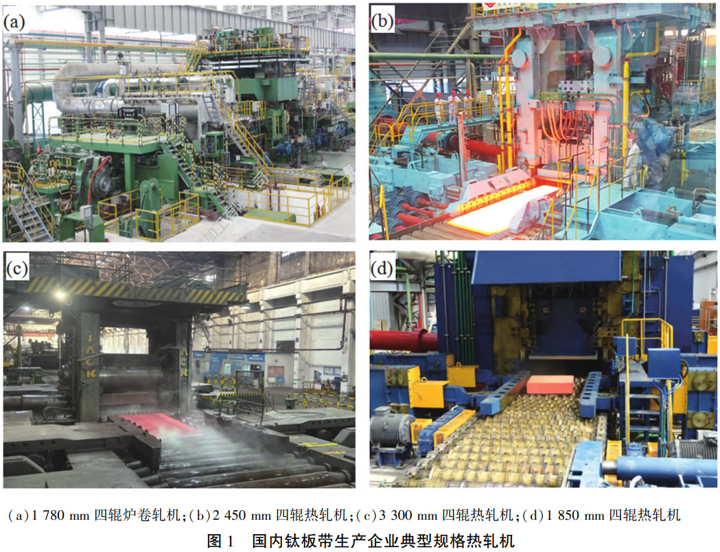 图1为国内钛板带典型生产企业热轧生产线现场图。图1(a)为攀钢集团沈阳有色金属加工厂1780 mm四辊可逆钛板带炉卷热轧机组,2013-2014年由意大利达涅利集团公司和国内鞍钢重型机械有限公司联合设计制造。图1(b)为新疆湘晟新材料科技有限公司2450mm四辊可逆钛板材热轧机组,2017-2018年由二重(德阳)重型装备有限公司设计制造。图1(c)为宝钛集团公司3300mm四辊可逆钛板材热轧机组,20世纪七八十年代由法国SACK公司设计制造,宝钛集团于1989年从原西德引进。图1(d)为宝钛股份1850mm四辊可逆宇航级钛板材热轧机组,2020-2021年由中国一重设计制造。