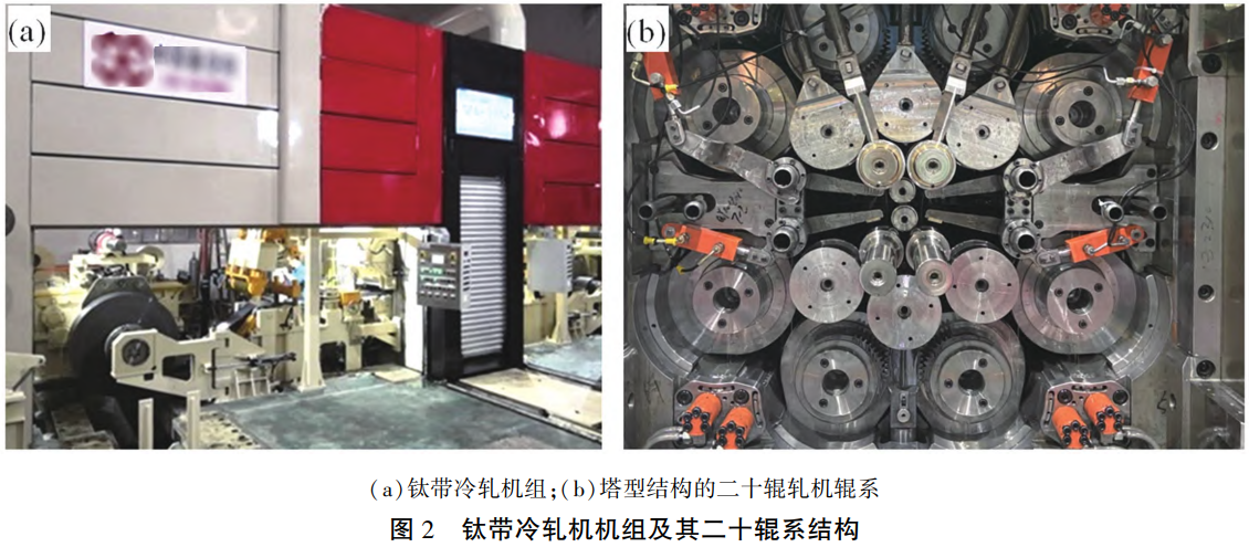 钛的屈服强度高,轧制反弹性较强,且密排六方结构导致各向异性显著,使用普通两辊或四辊轧机较难实现钛薄板带的轧制,为了满足要求,目前行业生产时主要采用六辊、二十辊等多辊轧机进行轧制。其中二十辊轧机是生产高精度钛薄带和箔材的最佳机型[9]。冷轧宽而薄的钛带材时,随着变形程度的增加,变形抗力加大,要求轧辊的弹性压扁要小,而当轧辊的压扁量等于或接近产品的厚度时,其再轧制的变形量将趋于零。轧辊的压扁量与轧辊的直径和轧制力呈正比。因此,要轧制厚度很小的带材,唯一的途径就是选择小直径的工作辊。但是高精度带材的厚度精度和横向厚差要求高,轧制过程中需要承受较大的变形抗力,这与小直径轧辊相矛盾。塔形辊系的多辊轧机很好的解决了使用小直径工作辊的技术问题,轧制力相对较小,可减少轧制磨擦发热和轧辊磨损以及轧制力矩。相比传统四辊轧机,以二十辊辊系为代表的多辊冷轧机具有横向刚度高、控制精度高、产品板型质量好、道次加工率大、节能等优点,但其结构也较为复杂。图2(a)为中国重型机械研究院股份公司设计制造的钛带冷轧机组,图2(b)为塔型结构的钛带二十辊轧机辊系。